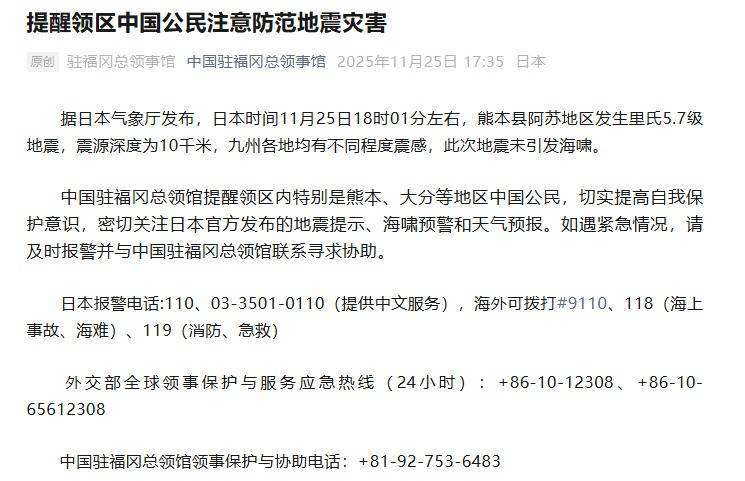 中国驻福冈总领事馆发文提醒领区中国公民注意防范地震灾害:据日本气象厅发布海通众合,日本时间11月25日18时01分左右,熊本县阿苏地区发生里氏5.7级地震,震源深度为10千米,九州各地均有不同程度震感,此次地震未引发海啸。